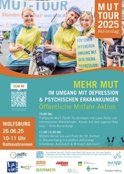 Komm mit und setze ein Zeichen für einen offenen Umgang mit psychischen Erkrankungen! Gemeinsam radeln, austauschen und Mut machen. Die Mitfahraktion ab Wolfsburg startet am 26.06 ab 10:00 Uhr am Rathausbrunnen, dort kannst du dich mit anderen interessierten Mitradelnden treffen und dann gemeinsam die MUT-TOUR begleiten. Ziel ist unser Aktionstag in Braunschweig auf dem Platz der Deutschen Einheit ab 13:00 Uhr. Neben Mitmach-Aktionen und Info-Ständen wird es viel Gelegenheit geben, um sich auszutauschen.